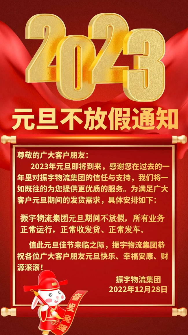 2023年元旦即將到來,感謝您在過去的一年里對振宇物流集團的信任與支持,我們將一如既往的為您提供更優(yōu)質(zhì)的服務(wù)。為滿足廣大客戶元旦期間的發(fā)貨需求,具體安排如下: