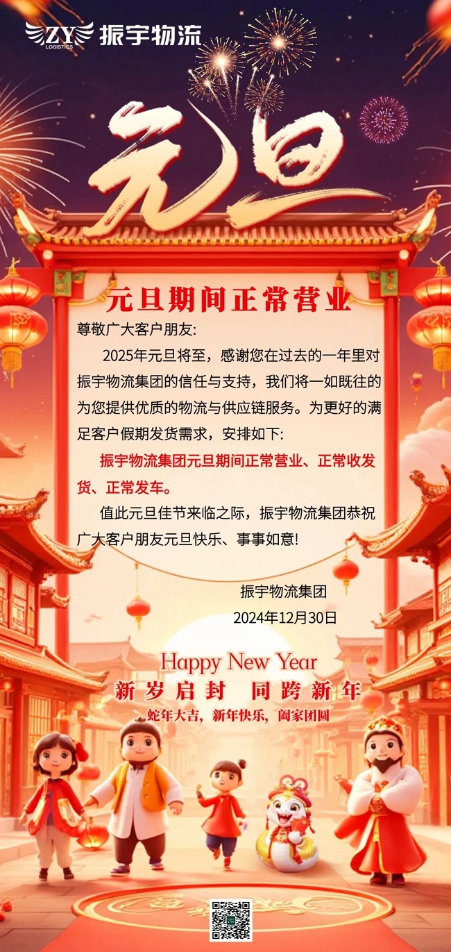 2025年元旦將至,感謝您在過去的一年里對振宇物流集團(tuán)的信任與支持,我們將一如既往的為您提供優(yōu)質(zhì)的物流與供應(yīng)鏈服務(wù)。為更好的滿足客戶假期發(fā)貨需求,安排如下: