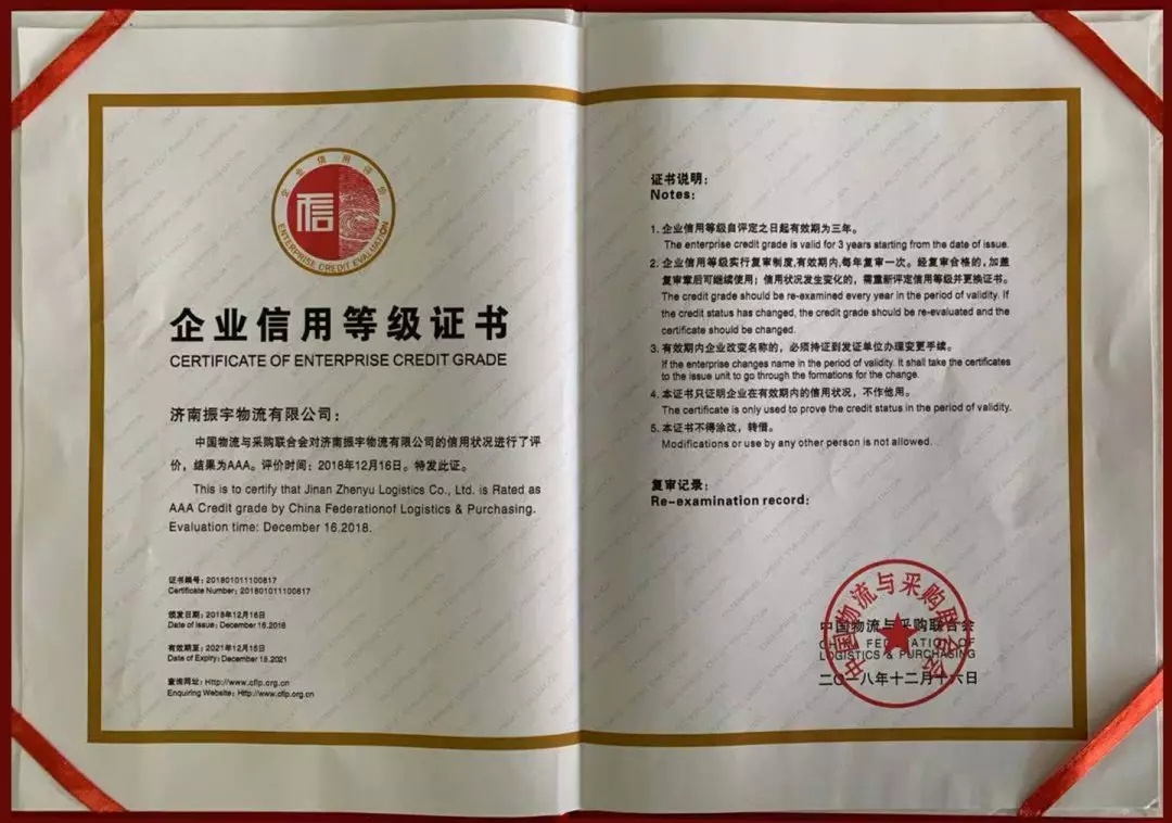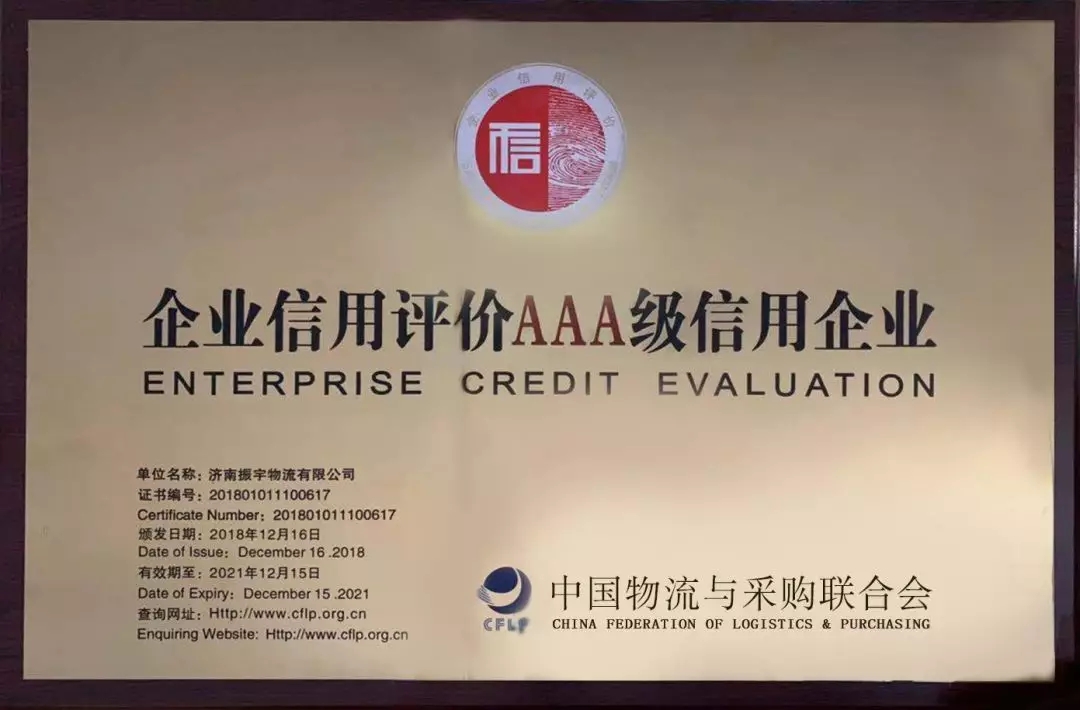 濟(jì)南振宇物流有限公司:國(guó)家3A級(jí)信用企業(yè)