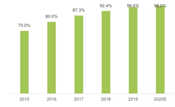 圖2 2015—2020年快遞網(wǎng)點鄉(xiāng)鎮(zhèn)覆蓋率變化情況