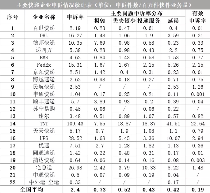 全國(guó)快遞企業(yè)申訴率(百萬(wàn)件快件業(yè)務(wù)量)平均為2.40,有效申訴率平均為0.19。用戶對(duì)快遞企業(yè)申訴主要問(wèn)題中,快件損毀申訴率平均為0.73,快件丟失短少申訴率平均為0.52,投遞服務(wù)申訴率平均為0.43,快件延誤申訴率平均為0.42。