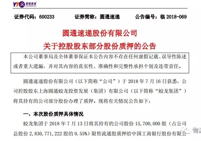 7月17日,圓通速遞發(fā)布關(guān)于控股股東部分股份質(zhì)押的公告。公告顯示,公司控股股東上海圓通蛟龍投資發(fā)展(集團)有限公司(以下簡稱“蛟龍集團”)將其持有的公司部分股份辦理了質(zhì)押。