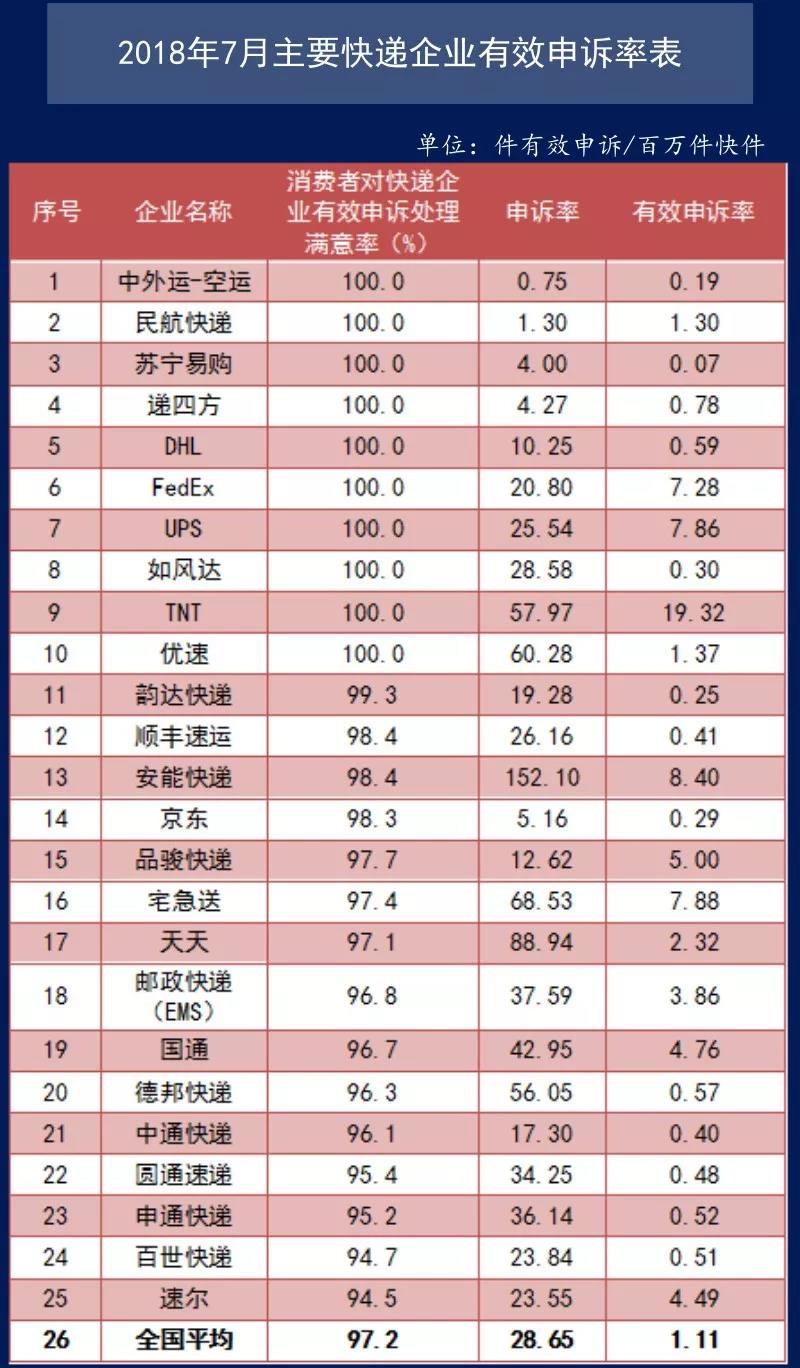 7月,消費(fèi)者對(duì)快遞企業(yè)有效申訴處理滿(mǎn)意率(消費(fèi)者對(duì)快遞企業(yè)有效申訴處理滿(mǎn)意件數(shù)與快遞企業(yè)有效申訴總量之比)為97.2%,低于全國(guó)平均有效申訴處理滿(mǎn)意率的快遞企業(yè)有9家。