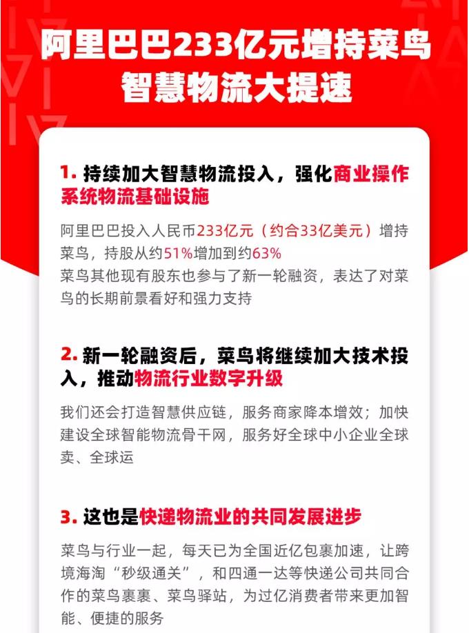 阿里巴巴集團(tuán)11月8日宣布,為持續(xù)加大智慧物流投入,強(qiáng)化商業(yè)操作系統(tǒng)物流基礎(chǔ)設(shè)施,已領(lǐng)銜完成對菜鳥網(wǎng)絡(luò)新一輪增資。阿里巴巴通過增資和購買老股的方式,投入人民幣233億元(約合33億美元),持有菜鳥股權(quán)從約51%增加到約63%。菜鳥其他現(xiàn)有股東也參與了新一輪融資,表達(dá)了對菜鳥的長期前景看好和強(qiáng)力支持。